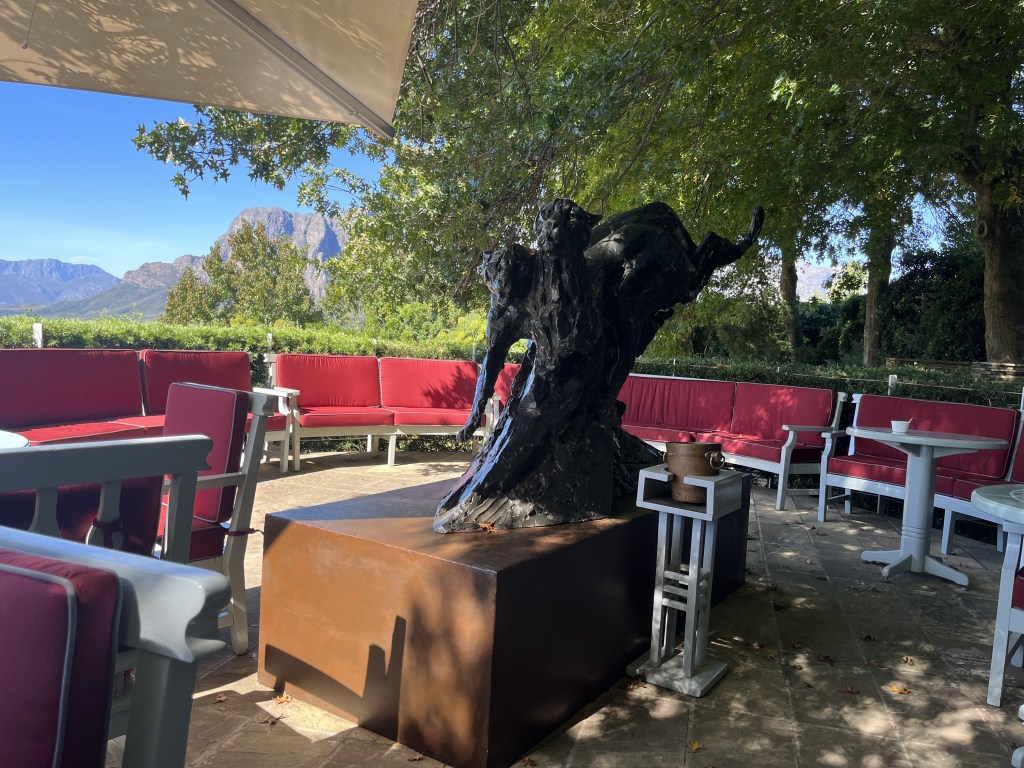 Graffe was the 3rd stop on the tour. Another very modern winery that dabbled in fine food. With a sprawling view of mountains and vineyards, a sleek two leopard statue guarding us, and delicious cuisine, it was quite the lunch. Our venture home was filled with discussion of culture, sports, and our upcoming safari. Charlie had worked in the bush BC (before children) and had us on the edges of our seat.