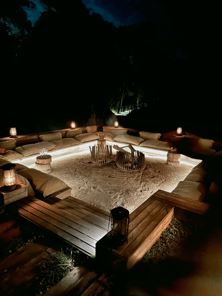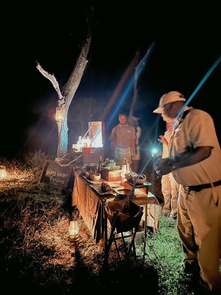 Sleeping lions led to drinks and snacks at sundown. Sure enough, more food. Back at camp, we were surprised with a romantic private dinner with candles and champaign set up in our room. We made a pit stop at the fire pit before heading up. The dinner was delicious and quite special.