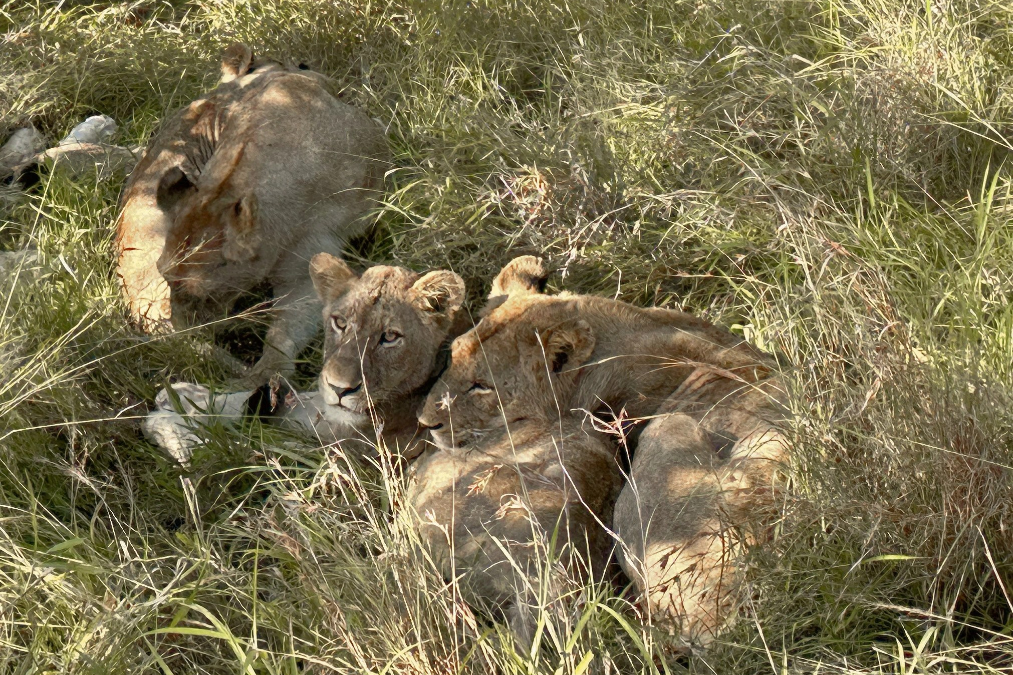 Turns out thank you’s were due. Between 4 guides and 4 trackers, the Sand Lion Pride was found hiding in tall grass. Two trackers, on foot, found them. Our truck had to be within feet to actually see them. 13 lions resting, camouflaged in the bush was quite the scene. Only thing missing were the 2 cubs and their mother.