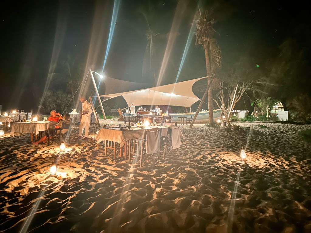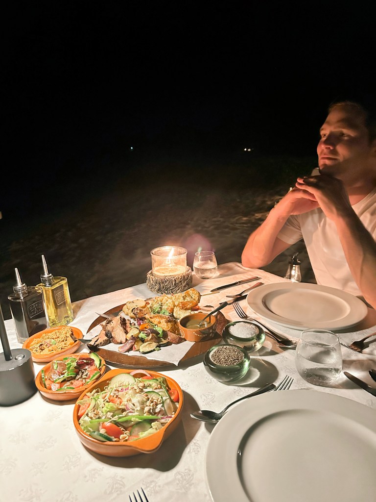 Dinner was set at the beach, with candlelight and soft lapping waves. Our adventure guide stopped by our table to discuss the activities for the week. Snorkling, sunset sail, and private picnics to come!