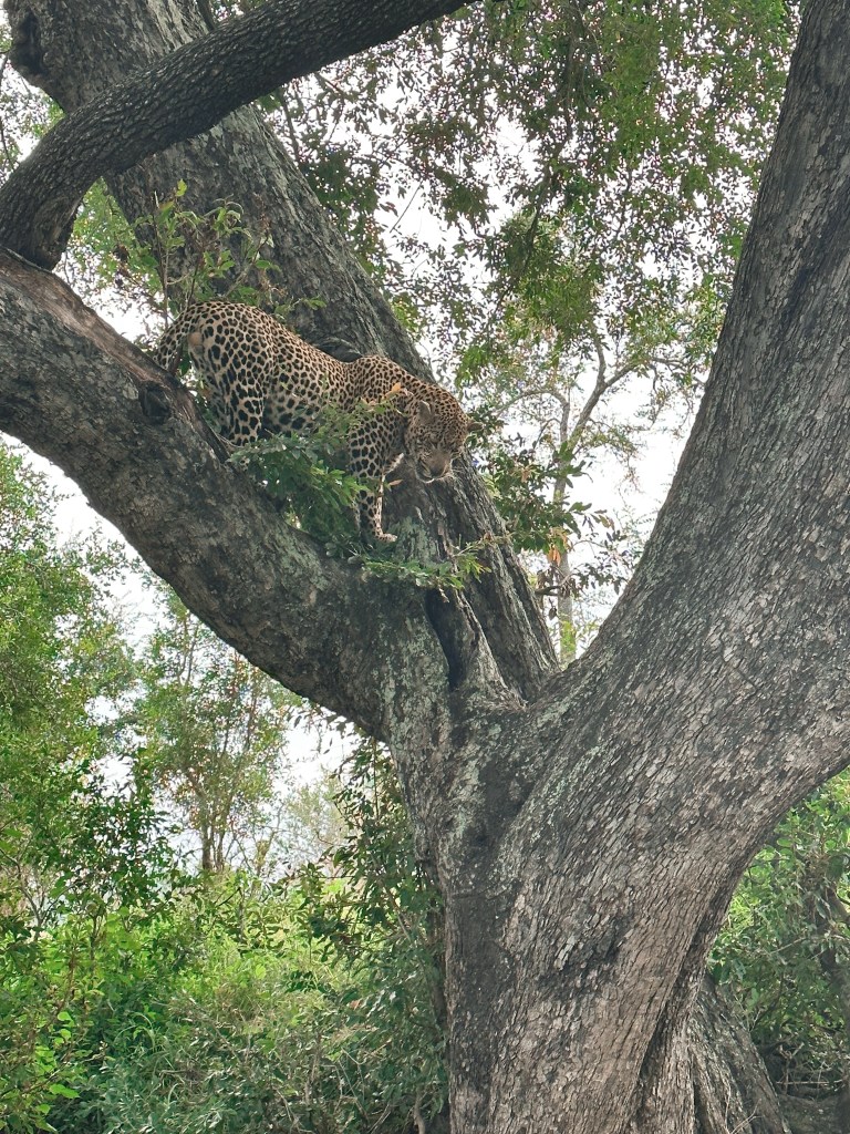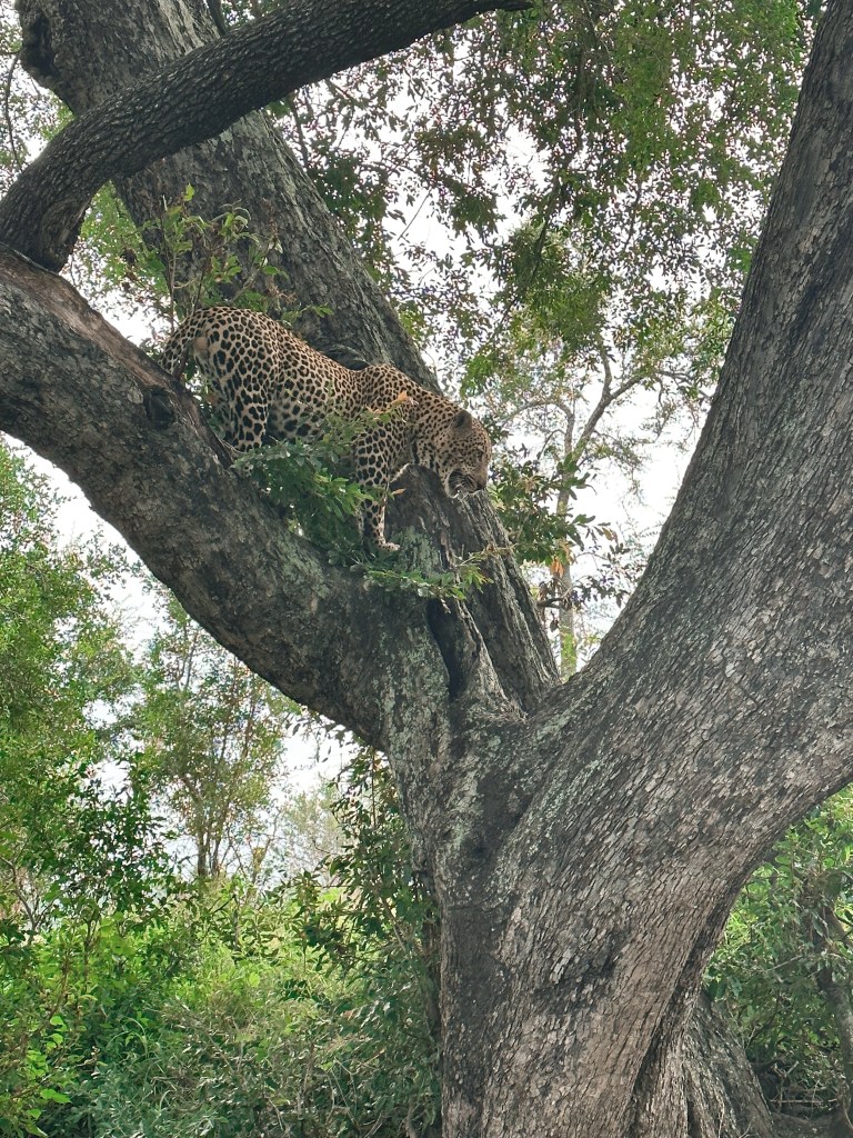 With our bags fully packed, we were lucky enough to sneak in 1 more morning drive. We checked on the leopard from the night before. It was still in the tree, with two hungry hyenas salivating below. After a few minutes, the leopard leapt down from the tree and made its way to the river for a drink. It gave the hyenas a death stare and a good look at its sharp teeth, as if to say, ‘don’t even think about going after my kill, or you will be next’.