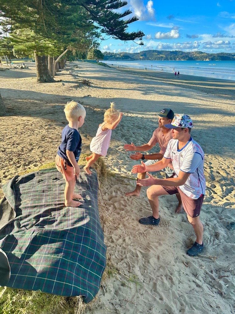With the afternoon winding down, we walked back and tested out the DIY outdoor shower – if only we could amazon prime an outdoor shower to our Denver home. The executive decision to eat local fish and chips at the beach for dinner was the perfect choice. Fresh caught and lightly breaded red snapper served with kūmara chips (like sweet potato fries but better?) were quickly devoured. Next up – dune jumping! Dylan and Mays leapt into the open arms of their parents over and over again, until Brian offered to sub in for Halsey as one of the catchers. We tried to get a simultaneous kid jump but just couldn’t quite nail the timing. Adults and kids alike were fading. After a nice evening chat on the porch, it was time for bed.
