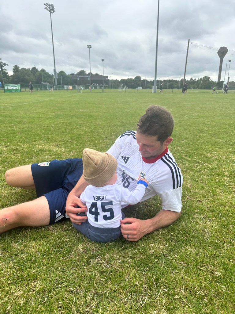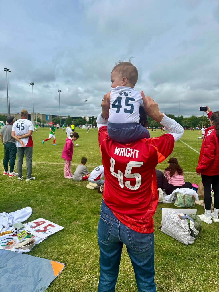 While Brian was off chasing early-morning glory on the pitch against Czechia, Anna and Liam stayed firmly team cozy. A slow, sleepy start gave way to a casual breakfast and a stroll to the neighborhood park, where Liam inspected the grass and kept a close eye on every passing dog and bird.
