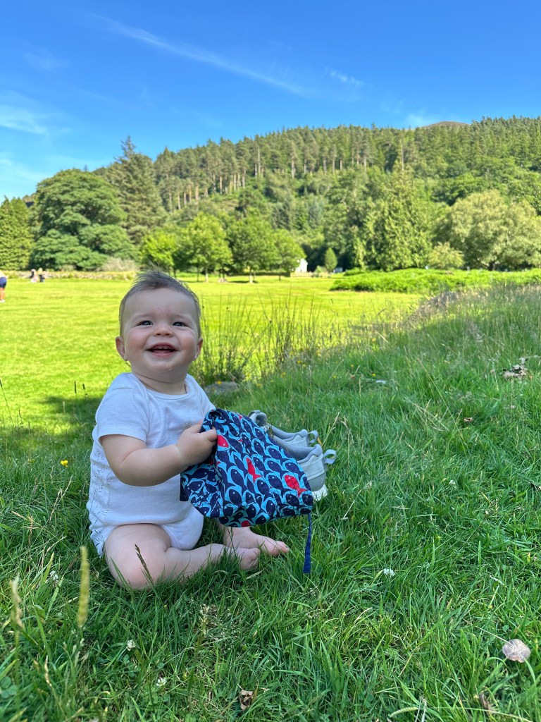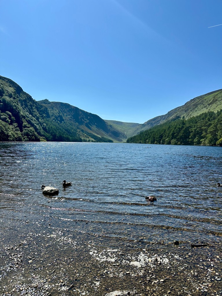 We dawdled a bit, soaking up the coastal calm, before driving inland to Glendalough—a hot tip from a taxi driver on our first day, and one that delivered big time. Tucked deep in the Wicklow Mountains National Park, this lakeside gem gave us peak Ireland: hills rolling in every shade of green and a still lake perfect for dipping our toes in the water.